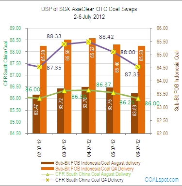 According to DSP of SGX AsiaClear OTC coal swaps, Indonesian sub-bituminous coal swaps for August 2012 delivery closed average at US$ 63.53 / MT on 6 July 2012 (Friday), 8pm SG Time compared to Monday opening of average US$ 63.73 / MT.