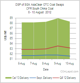Sub-Bit FOB Indonesia coal swaps for September delivery opened on Monday (6 August 2012) at US$ 62.33 pmt and closed on Friday (10 August 2012) at $ 63.14 gained around $ 0.81 pmt. The Q4 deliveries and Cal 13 deliveries also gained $1.12 and $1.01 respectively. The Indonesian coal swaps performed well last week.