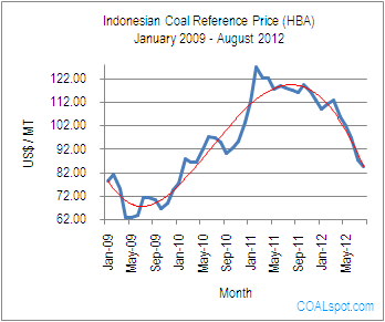 The monthly coal reference price for coal sales this month fell 3.32 percent. HBA fell to lowest level since September 2010. The Ministry of Energy & Mineral Resources of Indonesia sets the coal’s spot price for August 2012 at US$ 84.65 per ton, US$ 2.91 lower than July 2012 Price.