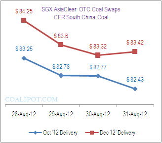 On 28 August CFR South China coal shipments to China (delivery October 2012) was opened at $ 83.50 and closed on 31 August at $ 82.43 lost $ 1.07 pmt. The swap lost 0.410 percent D-o-D and 1.281 percent W-o-W on Friday.