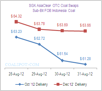 Sub-Bit FOB Indonesia coal contracts for October 2012 delivery closed at US$ 61.28 on Friday (31 August 2012) compared to US$ 63.23 Tuesday (28 August 2012) closing, lost US$ 1.95 per MT. CFR South China coal October delivery lost US$ 0.82 for the same period.