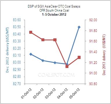 On 1 October CFR South China coal shipments (delivery December 2012) was opened at $ 82.95 and closed on 5 October at $ 83.50 up $ 0.55 per mt. The CFR South China coal swaps for December’12 deliveries up 0.663 percent and 0.626 percent on w-w and d-d respectively on 5 October 12.