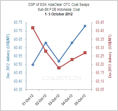 Sub-Bit FOB Indonesia coal swaps for December 12 delivery opened on Monday, 1 October 2012 at US$ 60.67 pmt and closed on Friday (5 October 2012) at $ 60.73 gained around $ 0.06 pmt. However December 2013 deliveries lost US$ 0.41 per MT for the same period.