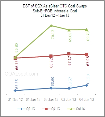 AsiaClear OTC Sub-Bit Indonesia coal swap for average Q4’ 2013 delivery closed US$ 3.18 higher compared to average Q1’ 2013 delivery price of US$ 63.90 on 4 January 2013. The calendar 2014 coal swap has closed US$ 5.80 higher than Q1 ‘ 2013 swap.