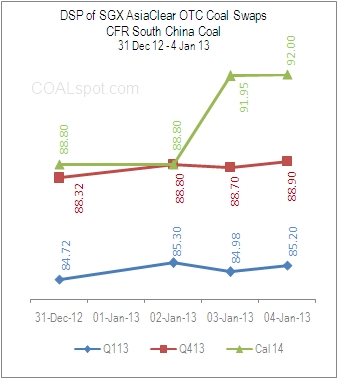 CFR South China coal shipments (average Q1’ 2013 delivery) was opened at $ 85.38 on 31 December and closed at $ 85.20 on 4 January 2013 down US $ 0.18 PMT. In the meantime, the CFR South China coal swaps for Q4’ 2013 delivery gained 0.9 percent W-o-W but lost 0.05 percent on D-o-D.