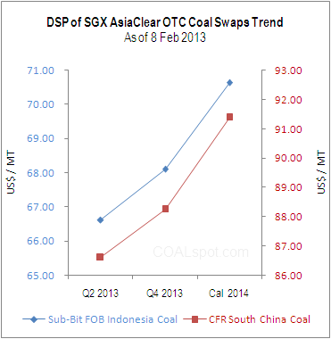 AsiaClear OTC Sub-Bit Indonesia coal swap for average calendar 2014 delivery closed US$ 4.01 (+6.01 %) higher compared to average Q2 delivery price of US$ 66.62 on 8 February 2013. In the meantime, the Q4’ 2013 coal swap has closed US$ 1.48 (+2.22 %) higher than Q2 ‘ 2013 swap on 8 February 2013.
