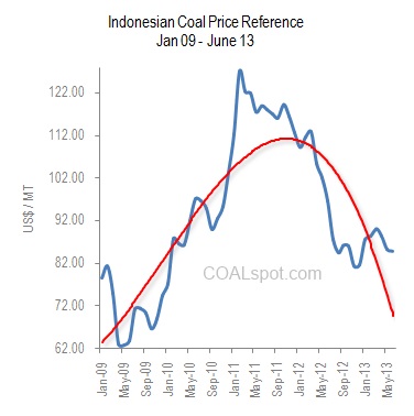 COALspot.com - Indonesian Coal Price Reference continues to take its lumps this month, dropping about 0.54 % and hitting a 2013 low. The Indonesian government’s declared coal bench mark price has lost marginally (US$ 0.46 / MT) in June 2013.