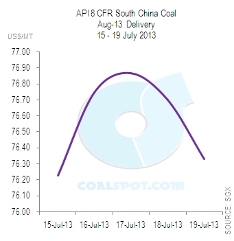 API 8 CFR South China Coal swaps for August 2013 delivery have achieved a highest price (US$ 76.87) on 17 July 2013. In the meantime, swap has experienced a lowest level (US$ 76.23) on 15 July 2013.