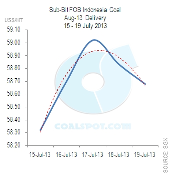 The sub-bit Indonesia's coal swap for August 2013 delivery has achieved highest price (US$ 59.02 / MT) on 17 July 2013. In the meantime, swap has reached its lowest level (US$ 58.32 / MT) on 15 July 2013.