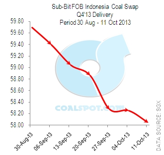 Sub-Bit FOB Indonesia coal swap for (average) Q4 2013 delivery was closed at US$ 58.05 per MT or US$ 0.21 lower compared to the same period last week.