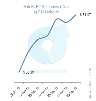 The sub-bit Indonesia's coal swap for Q1’ 2014 delivery has achieved highest price (US$ 61.97/ MT) on 29 November 2013. In the meantime, swap has reached its lowest level (US$ 61.25/ MT) on 25 November 2013.