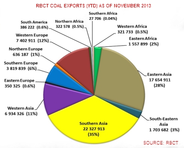 Southern Asia countries alone have imported 22,327,913 tons of coal YTD or around 35% of total exported quantity through RBCT for first 11 months of 2013.