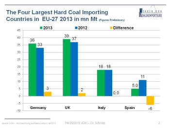 A slight increase in coal imports in the EU has been perceptible in the last two years, particularly in the UK, Italy, Spain and Germany. Falling hard coal production in Germany, Spain and England has been compensated by an increase in imports. Spain will import about 6 million tonnes less steam coal in 2013, due to increased electricity generation from renewables and the weak economy. Italy will return to the 2012 level.