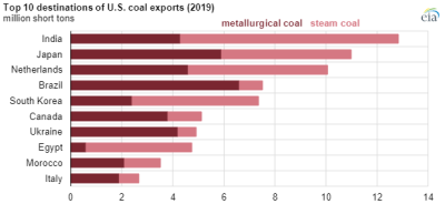 In 2019, India, Japan, the Netherlands, Brazil, and South Korea were the top five destinations for U.S. coal exports. Together, these countries accounted for 53% of coal exports.